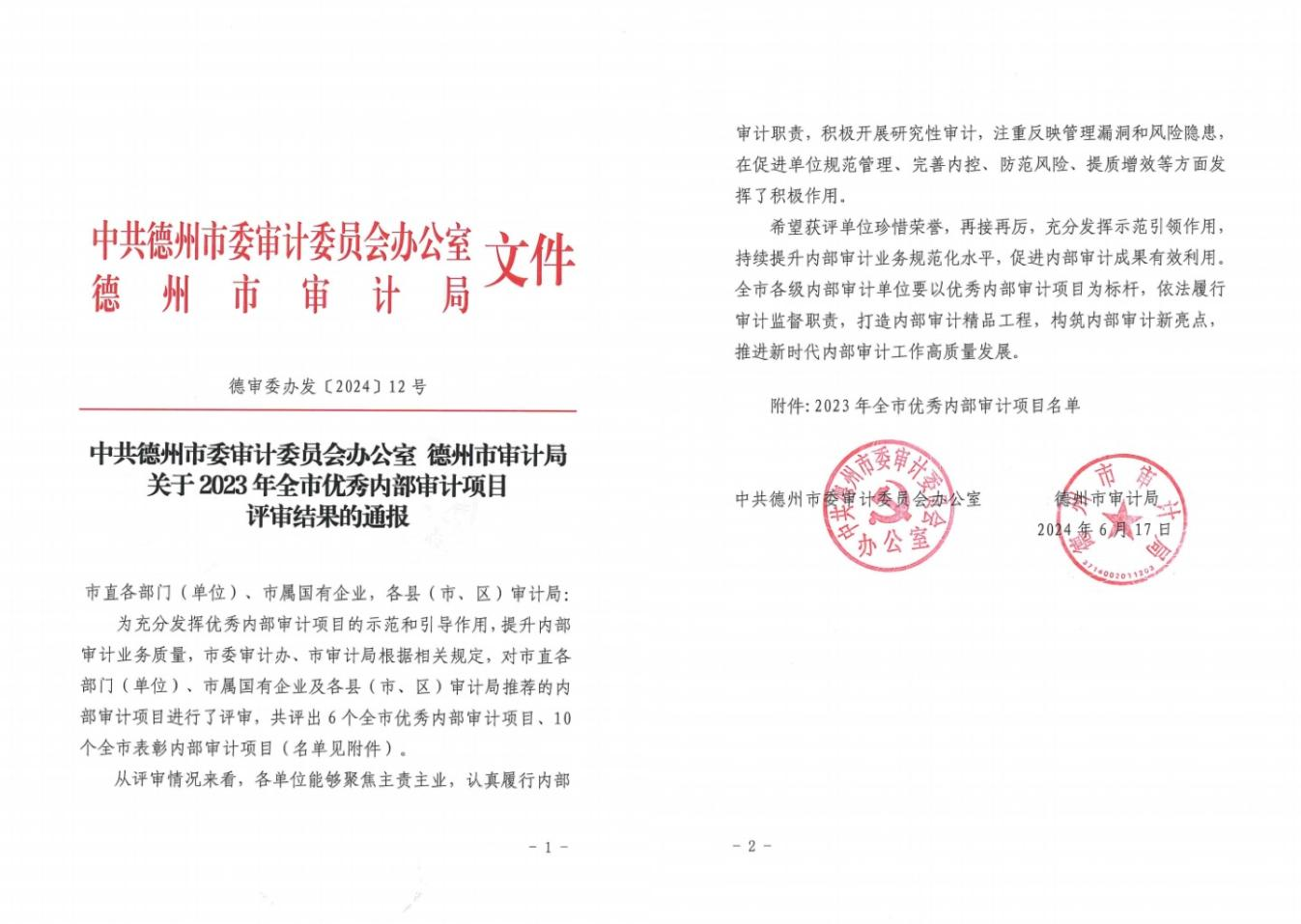 喜報(bào)│財(cái)金集團(tuán)內(nèi)審項(xiàng)目獲評(píng)“德州市2023年度優(yōu)秀內(nèi)部審計(jì)項(xiàng)目”