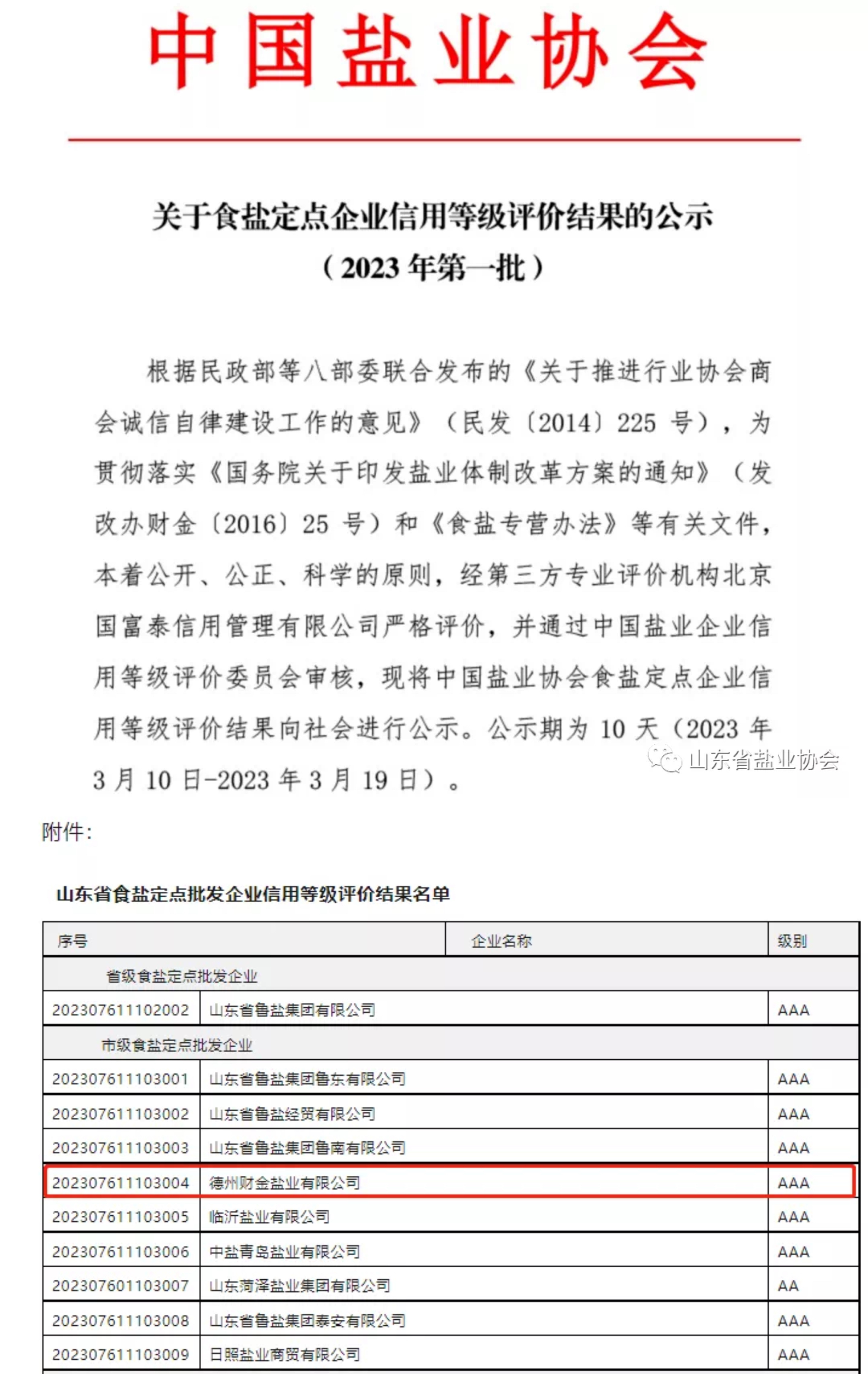 直屬企業(yè)│德州財金鹽業(yè)公司獲評全國食鹽定點企業(yè)最高信用AAA等級